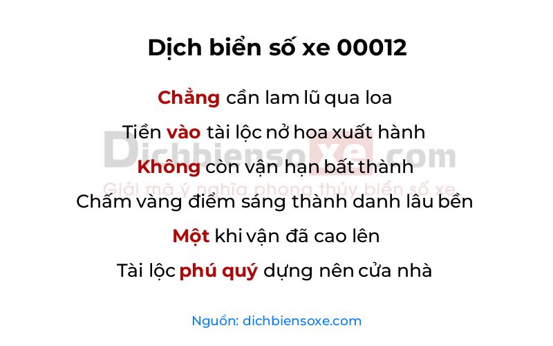 Kết luận: Biển số 00012 là biển số trung bình, có ý nghĩa là Khởi đầu Nhất tiến. Biển số 00012 được đánh giá là một trong những biển số có giá trị tương đối cao.
