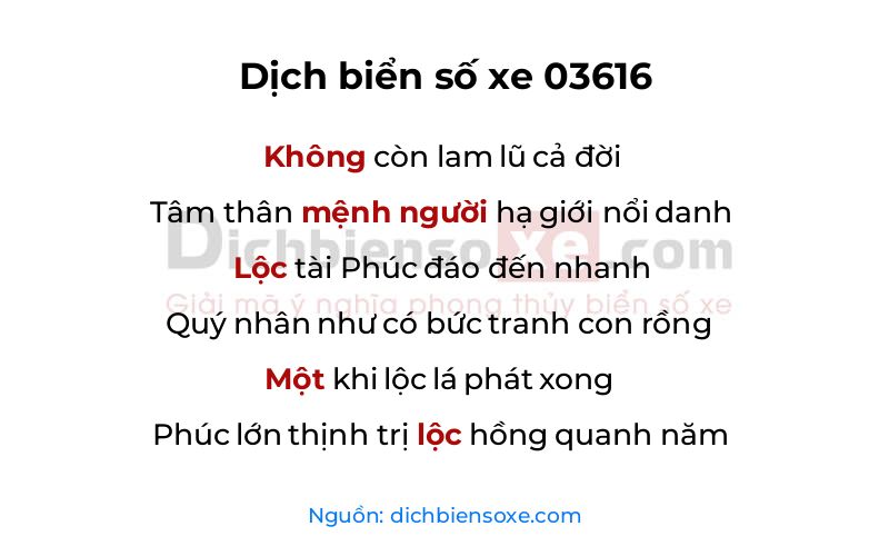 Kết luận: Biển số 03616 là biển số tốt, có ý nghĩa là Vạn sự Nhất lộc. Biển số 03616 được đánh giá là một trong những biển số có giá trị tương đối thấp.