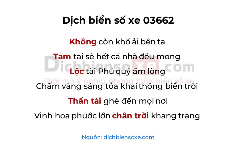 Trong 64 quẻ kinh dịch, biển số xe 03662 thuộc Quẻ Thiên Địa Bĩ. Quẻ Thiên Địa Bĩ có điềm “Hổ Lạc Thâm Khanh" – Cát ít hung nhiều, đây là một trong những quẻ Hung trong 64 quẻ kinh dịch.