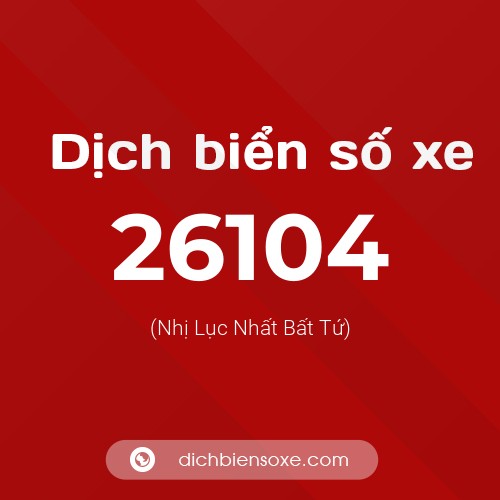 Biển số xe 26104 là biển xe có 3 nút, các con số trên biển số xe mang ý nghĩa là Lục Nhất Bất Tứ, đây là biển số xe hợp với những người mang Mệnh Kim, Mệnh Mộc. Bạn đang thắc mắc biển số xe 26104 có phải là một biển số xe đẹp, có mang lại ý nghĩa như ý cát tường cho người sở hữu nó hay không? Hãy cùng dichbiensoxe.com giúp bạn dịch rõ nghĩa của biển số xe 26104 nhé.