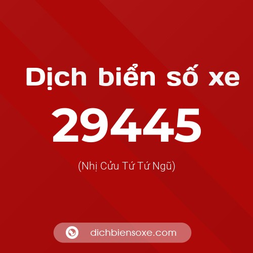 Biển số xe 29445 là biển xe có 4 nút, các con số trên biển số xe mang ý nghĩa là Cửu Tứ Tứ Ngũ, đây là biển số xe hợp với những người mang Mệnh Kim, Mệnh Mộc. Bạn đang thắc mắc biển số xe 29445 có phải là một biển số xe đẹp, có mang lại ý nghĩa như ý cát tường cho người sở hữu nó hay không? Hãy cùng dichbiensoxe.com giúp bạn dịch rõ nghĩa của biển số xe 29445 nhé.