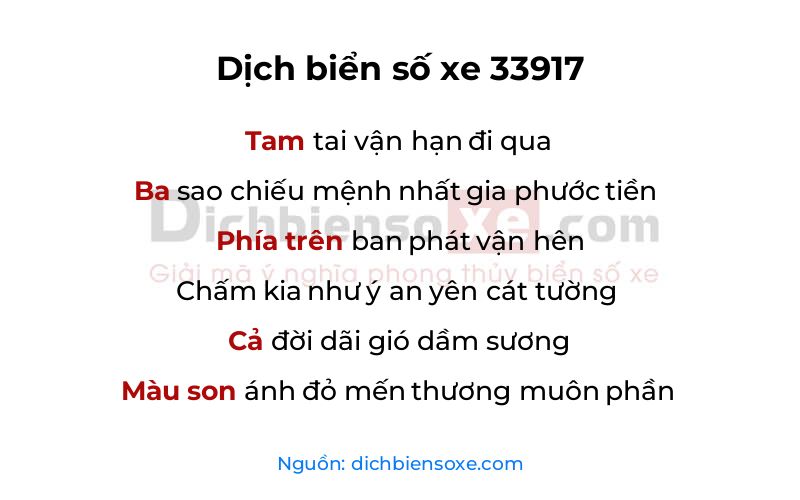 Trong 64 quẻ kinh dịch, biển số xe 33917 thuộc Quẻ Sơn Địa Bác. Quẻ Sơn Địa Bác có điềm “Oanh Thước Đồng Lâm(*)” – Việc làm không thành, đây là một trong những quẻ Hung trong 64 quẻ kinh dịch.